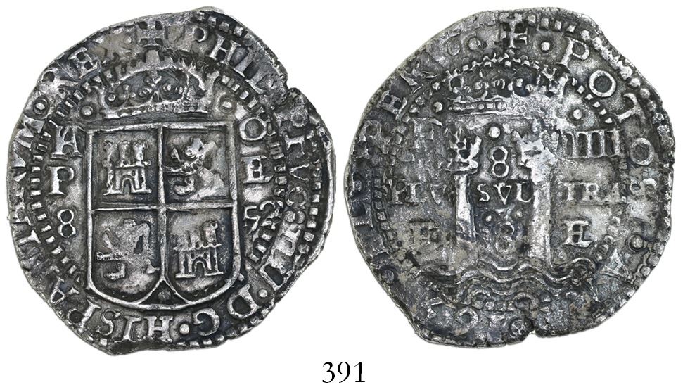 Potosi, Bolivia, cob 8 reales, 1652E Transitional Type IV/A, subtype with A/F to left of shield.