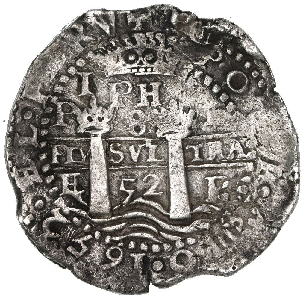 Potosi, Bolivia, cob 8 reales, 1652E Transitional Type VIII/A, unique variety without REX in legend, ex-Madonna. S-P37; KM-A20.8 var; Cal-1495 var. 27.14 grams. Broad flan with crude edge (as made) but nearly full and somewhat Royal-like details in terms of completeness, balance of striking pressure and lack of doubling (just a trace to right of shield), including full 1652 date and king's ordinal IIII in legend and choice interiors, VF+ with light spotty toning, faint surface scuffing on shield side. Type VIII/A is quite rare by itself, but apparently this is a unique variety (not listed in Mastalir) without REX at the end of the shield-side legend. Pedigreed to the J. Madonna Collection.