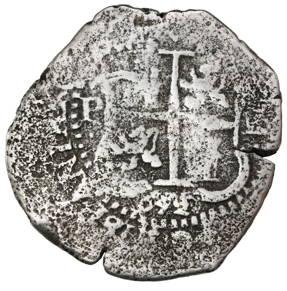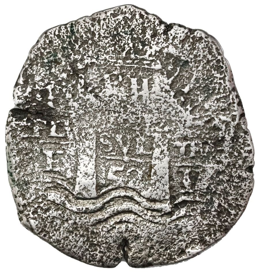 Potosi, Bolivia, cob 8 reales, 1652E post-transitional (Transitional Type VIII/B), 1-PH-6 at top, ex-Jones. S-P37a; KM-21; Cal-1500. 22.58 grams. Worn from corrosion but still solid and with most of pillars-and-waves and cross-lions-castles visible, two dates and assayers, three mintmarks, two small edge-splits. Pedigreed to the Dr. Peter Jones collection, with original Herman Moro certificate. Recovered from: Capitana, sunk in 1654 off Chanduy, Ecuador