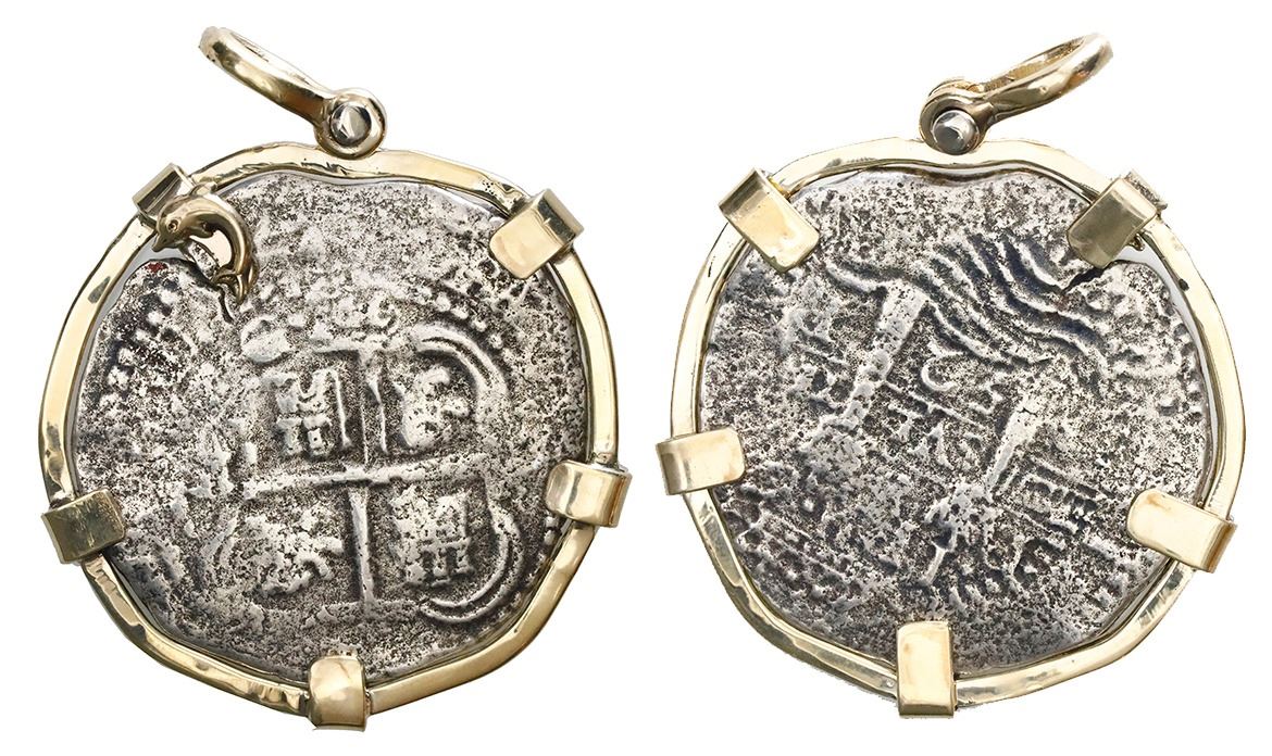Potosi, Bolivia, cob 8 reales, 1652E post-transitional (Transitional Type VIII/B), 1-PH-6 at top, ex-Capitana (1654), mounted in 14K gold bezel with shackle bail and dolphin embellishment. 30.28 grams total. Full pillars-and-waves and full but doubled cross on broad flan with peripheral flatness, light toning over worn (corroded) surfaces. From the Capitana (1654), with (generic) Moro certificate, pedigreed to our Auction 20, with original lot-tag #1795. Recovered from: Capitana, sunk in 1654 off Chanduy, Ecuador