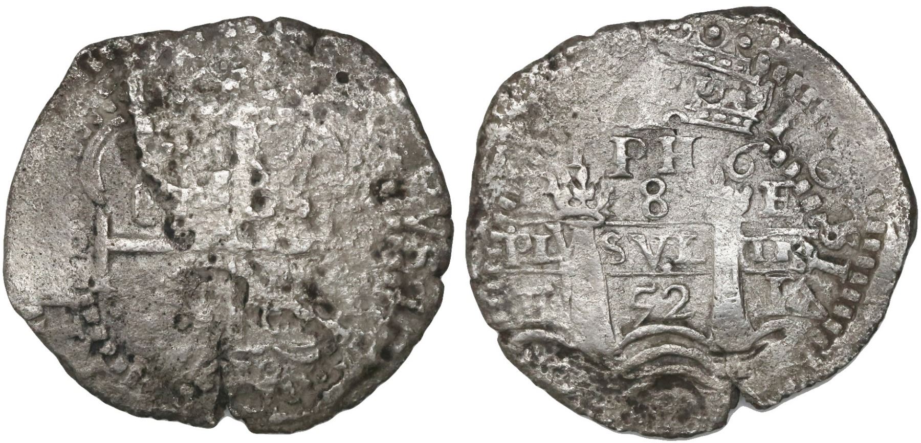 Potosi, Bolivia, cob 8 reales, 1652E post-transitional (Transitional Type VIII/B), 1-PH-6 at top.