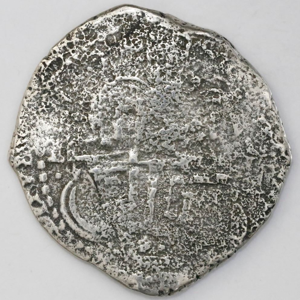 Potosi, Bolivia, cob 8 reales, 1652E post-transitional (Transitional Type VIII/B), 1-PH-6 at top. S-P37a; KM-21; CT-434. 21.68 grams. Cross mostly smooth from corrosion but pillars visible with clear date and denomination. With certificate from the salvagers. Recovered from: Capitana, sunk in 1654 off Chanduy, Ecuador