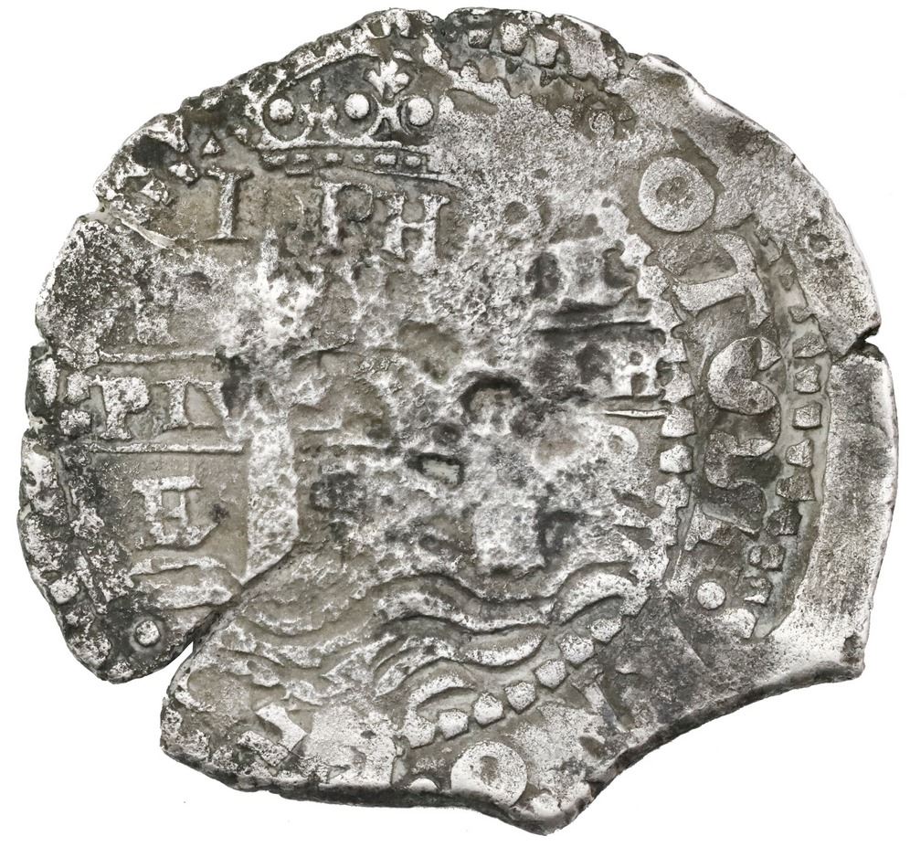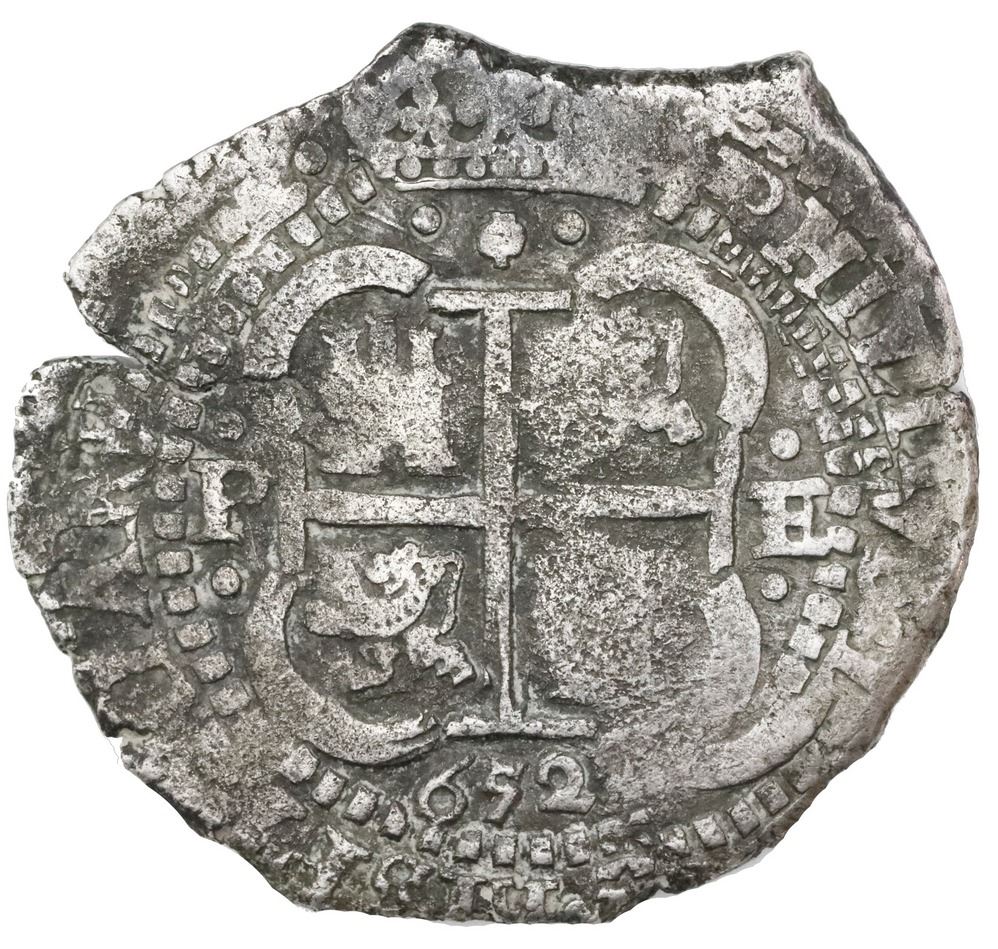 Potosi, Bolivia, cob 8 reales, 1652E post-transitional (Transitional Type VIII/B), 1-PH-6 at top. S-P37a; KM-21; Cal-1500. 24.81 grams. Good full cross with bold 652 date below, off-center pillars making for full POTOSI in legend, three assayers and mintmarks, some surface corrosion and light toning, edge-split. Recovered from: Capitana, sunk in 1654 off Chanduy, Ecuador
