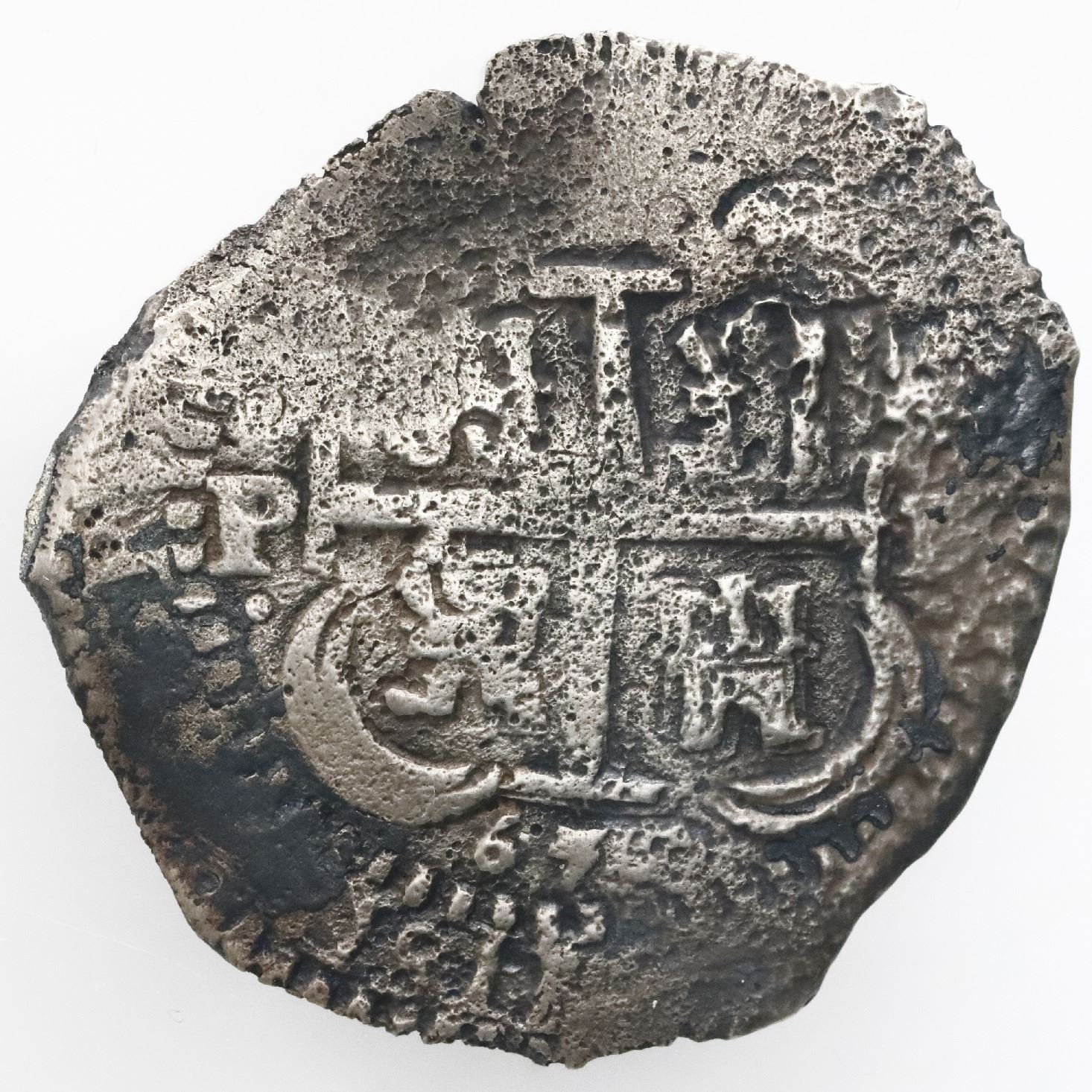 Potosi, Bolivia, cob 8 reales, 1652E post-transitional (Transitional Type VIII/B), 1-PH-6 at top. S-P37a; KM-21; Cal-1500. 23.86 grams. Corroded yet solid example with two dates visible, bold pillars and cross, a few spots of horn silver. From: Capitana, sunk in 1654 off Chanduy, Ecuador