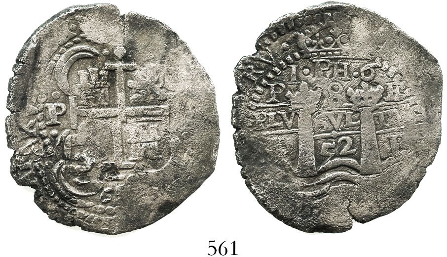 Potosi, Bolivia, cob 8 reales, 1652E post-transitional (Type VIII/B), 1-dot-PH-dot-6 at top, rare variety. S-P37a; KM-21; Janson-18.8.5. 24.6 grams. Good full pillars with clear 1-dot-PH-dot-6, nearly full cross, minimal corrosion but peripheral flatness, nicely toned all over, 2 dates, 3 mintmarks. Recovered from: Capitana, sunk in 1654 off Chanduy, Ecuador