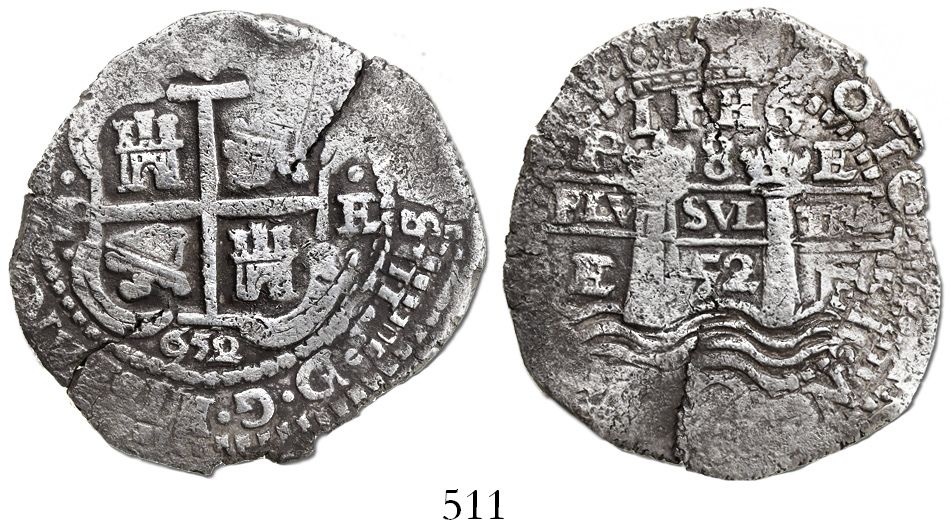 Potosi, Bolivia, cob 8 reales, 1652E post-transitional (transitional Type VIII/B), 1-PH-6 at top. S-P37a; KM-21; CT-434. 25.82 grams. Choice full cross, full pillars-and-waves (very light surface corrosion), two dates, three assayers, much legend, lightly toned, edge-splits. Pedigreed to the Rob McClung collection. Recovered from: Capitana, sunk in 1654 off Chanduy, Ecuador