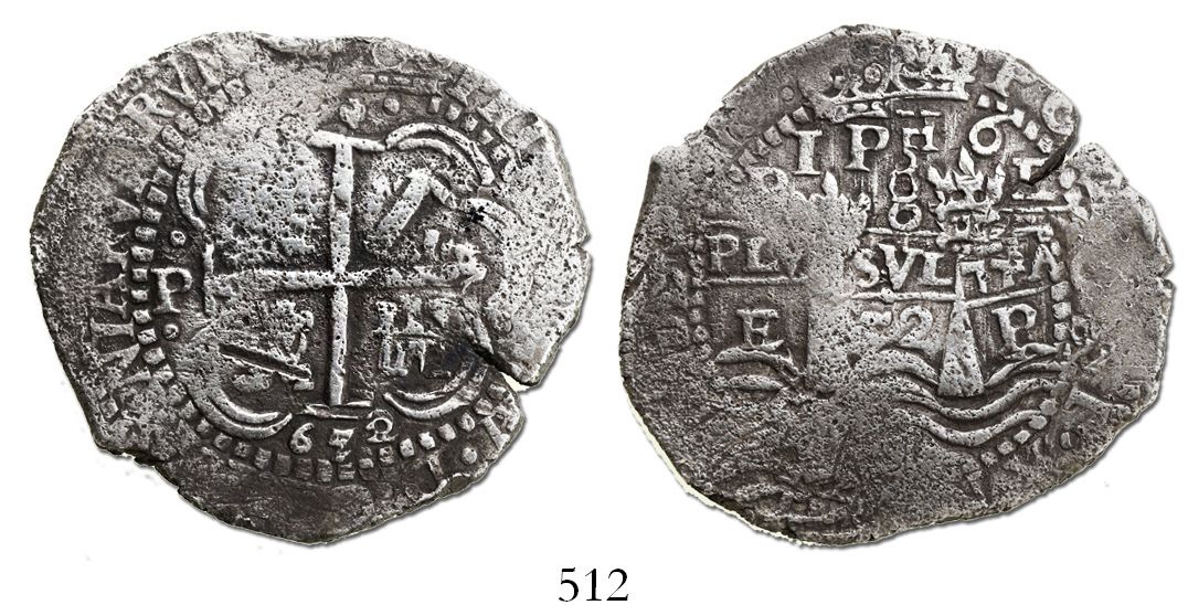 Potosi, Bolivia, cob 8 reales, 1652E post-transitional (transitional Type VIII/B), 1-PH-6 at top. S-P37a; KM-21; CT-434. 26.62 grams. Bold but doubled full central details, edge-split, light toning, two dates, three mintmarks, very light surface corrosion. Pedigreed to the Rob McClung collection. Recovered from: Capitana, sunk in 1654 off Chanduy, Ecuador