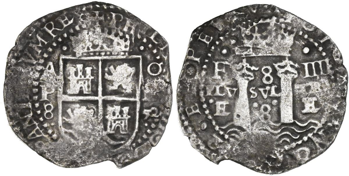 Potosi, Bolivia, cob 8 reales, 1652E transitional Type IV, from the Maravillas (1656).