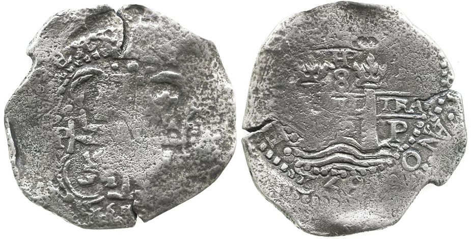 Potosi, Bolivia, cob 8 reales, 1652E transitional Type VII/B, rare (unlisted in Janson). S-P37; KM-unl; CT-unl. 22.8 grams. Worn from corrosion and with much flatness but with clear HP above one full pillar, bold P at bottom-right and clear date in legend; full but crude cross with P to left, lightly toned all over. Recovered from: Capitana, sunk in 1654 off Chanduy, Ecuador