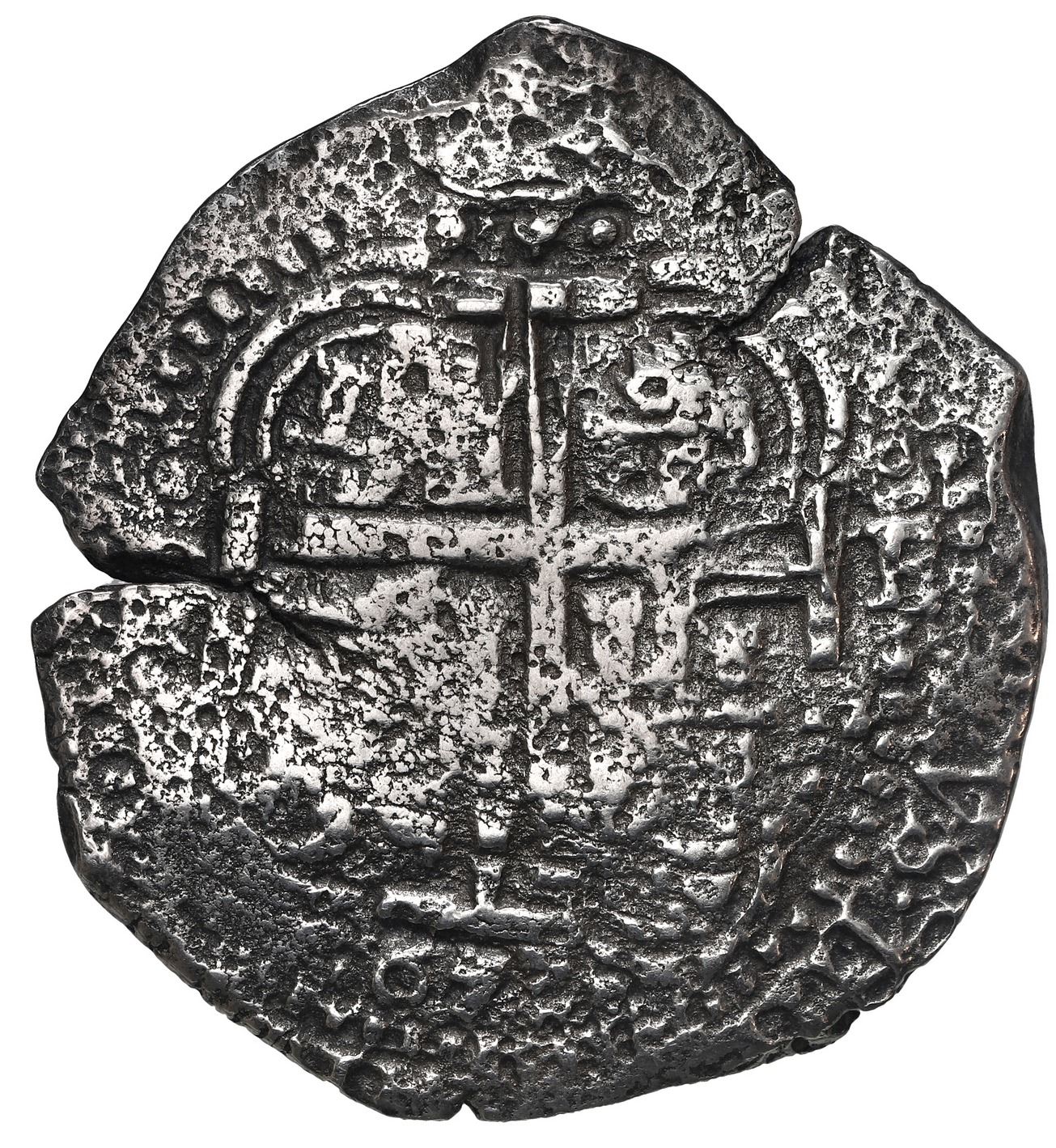 Potosi, Bolivia, cob 8 reales, 1653 E, dot-PH-dot at top. S-P37a; KM-21; Cal-1503. 24.15 grams. Smallish flan with some light corrosion, good full pillars-and-waves, weaker full cross with some doubling, parts of all three dates and assayers, tiny edge-splits, toned in crevices. From: Capitana, sunk in 1654 off Chanduy, Ecuador