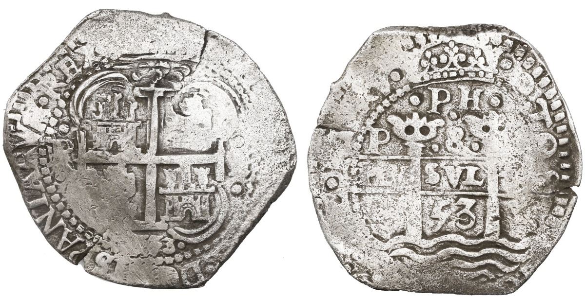 Potosi, Bolivia, cob 8 reales, 1653E, •PH• at top. S-P37a; KM-21; CT-437. 26.25 grams. Solid and uncorroded, with full pillars-and-waves and cross, full crown, uneven strike, two dates, toned in crevices. With Marex certificate and tag #0384. Recovered from: Maravillas, sunk in 1656 off Grand Bahama Island