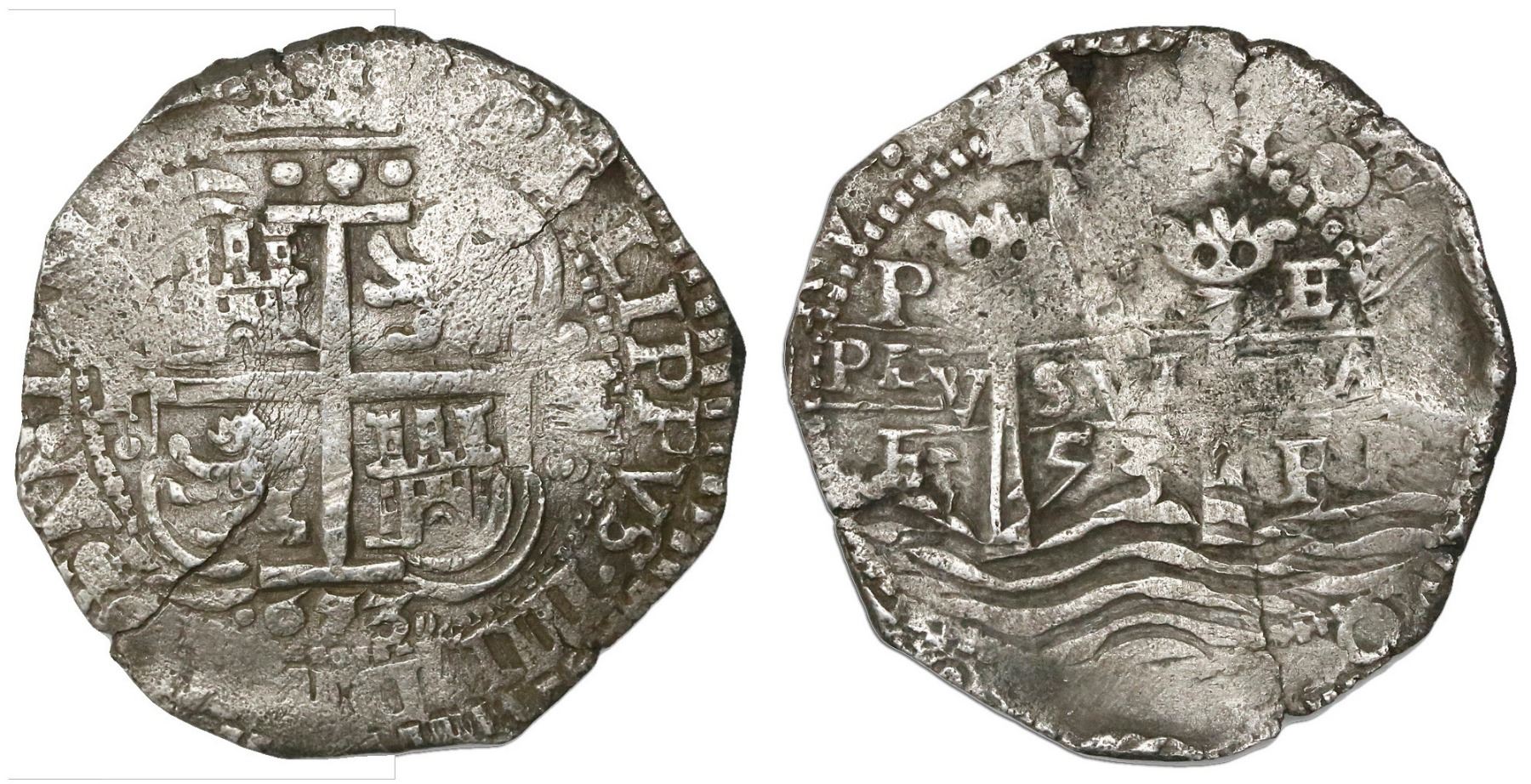 Potosi, Bolivia, cob 8 reales, 1653E, (PH) at top. S-P37a; KM-21; CT-437. 24.63 grams. Solid flan (just a little bent and with two small edge-splits) with full pillars-and-waves and cross-lions-castles, two clear dates, minimal surface corrosion and toning. Pedigreed to the Rob McClung collection. Recovered from: Capitana, sunk in 1654 off Chanduy, Ecuador