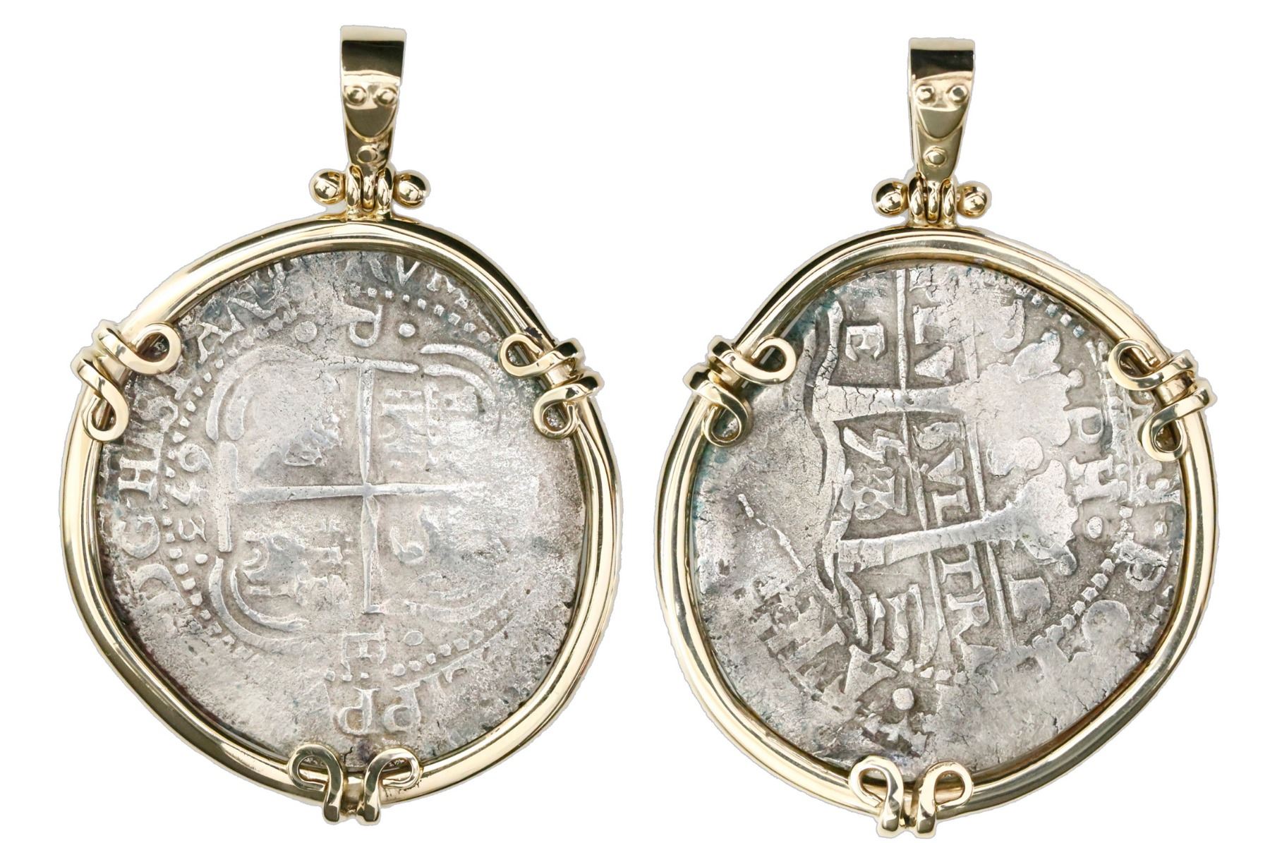 Potosi, Bolivia, cob 8 reales, 1653E, dot-PH-dot at top, ex-Capitana (1654), mounted cross-side out in heavy 14K gold bezel with shackle bail. 41.12 grams total. Solid, uncorroded specimen with full cross and pillars, low contrast. From the Capitana (1654).