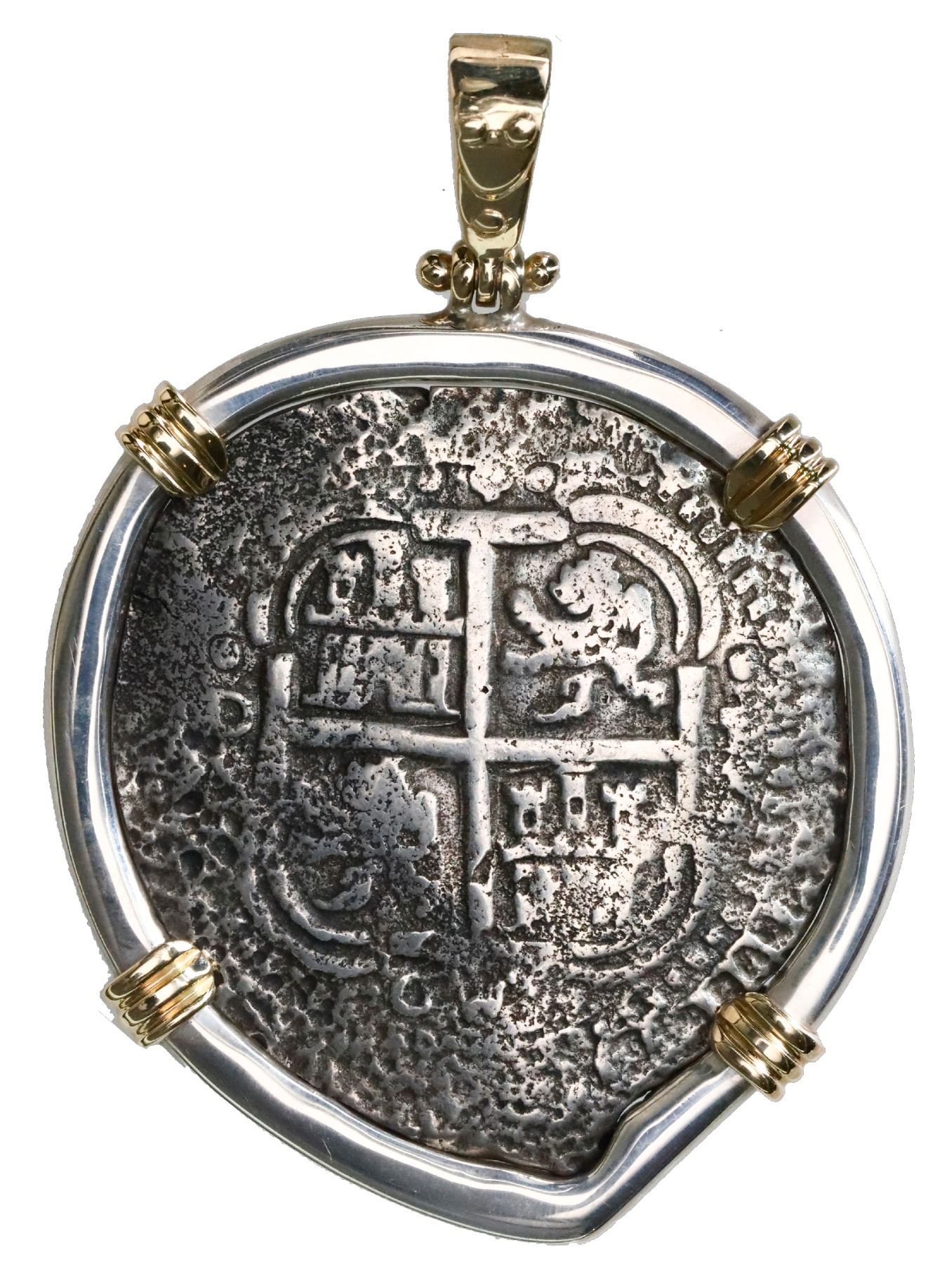 Potosi, Bolivia, cob 8 reales, 1653E, dot-PH-dot at top, ex-Capitana (1654), mounted cross-side out in thick silver bezel with 14K gold prongs and shackle bail. 35.71 grams total. Good full cross (only lightly corroded) aligned nicely with an edge-point at bottom, full pillars with some moderate corrosion on that side, toned in crevices. From the Capitana (1654).