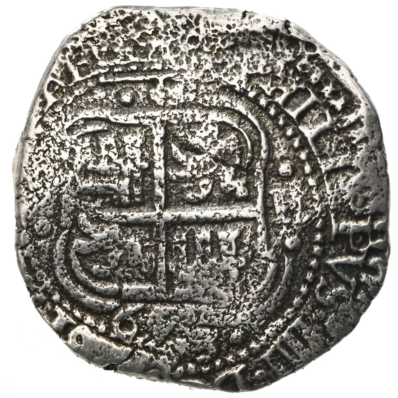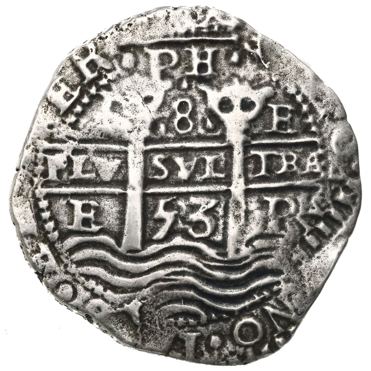 Potosi, Bolivia, cob 8 reales, 1653E, dot-PH-dot at top, three-digit date below cross. S-P37a; KM-21; Cal-1503. 21.99 grams. Choice piece with two complete dates plus a partial third date in the legend, smooth pillars side and lightly corroded cross side, full king's name and ordinal. From: Capitana, sunk in 1654 off Chanduy, Ecuador
