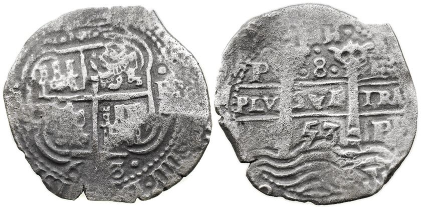 Potosi, Bolivia, cob 8 reales, 1653E, dot-PH-dot at top. S-P37a; KM-21; CT-437. 19.8 grams. Bold full pillars-and-waves and cross-lions-castles with minor doubling, 2 dates and mintmarks and assayers, lightly corroded all over, nicely brown-toned. Recovered from: Capitana, sunk in 1654 off Chanduy, Ecuador
