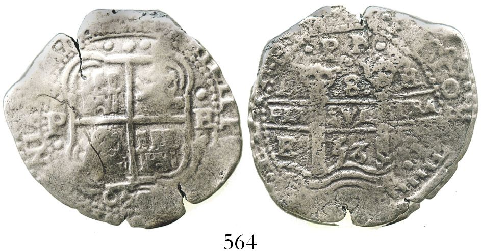 Potosi, Bolivia, cob 8 reales, 1653E, dot-PH-dot at top. S-P37a; KM-21; CT-437. 19.4 grams. Thin from corrosion but with good full cross and pillars-and-waves, 2 dates, 2 edge-splits. Recovered from: Capitana, sunk in 1654 off Chanduy, Ecuador