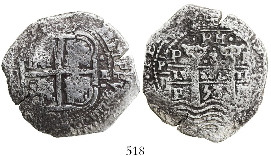 Potosi, Bolivia, cob 8 reales, 1653E, dot-PH-dot at top. S-P37a; KM-21; CT-437. 21.73 grams. Thin from corrosion but with good interior details, two dates and three assayers, toned on fields. Pedigreed to the Rob McClung collection. Recovered from: Capitana, sunk in 1654 off Chanduy, Ecuador
