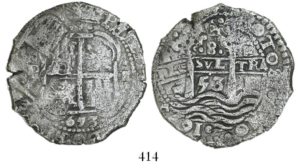 Potosi, Bolivia, cob 8 reales, 1653E, dot-PH-dot at top. S-P37a; KM-21; CT-437. 25.38 grams. Round flan with full but doubled cross and pillars-and-waves (the latter off-center), light surface corrosion and toning, three dates, parts of edge crude. Pedigreed to the Rob McClung collection. Recovered from: Capitana, sunk in 1654 off Chanduy, Ecuador