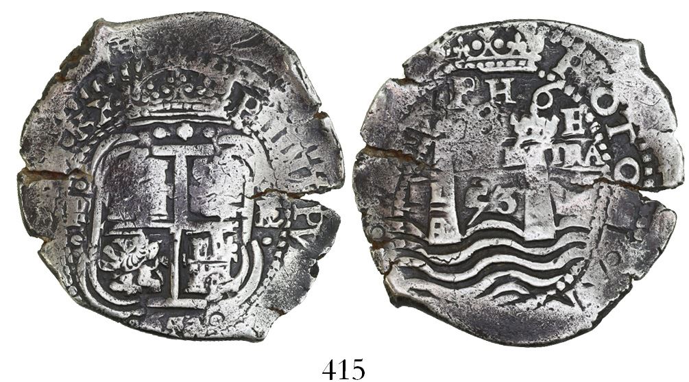 Potosi, Bolivia, cob 8 reales, 1653E, dot-PH-dot at top. S-P37a; KM-21; CT-437. 27.38 grams. Crudely uneven flan with edge-splits but corrosion-free and with full inner details despite flat spots and doubling (the waves particularly choice), two dates, nice toning. Pedigreed to the Rob McClung collection. Recovered from: Capitana, sunk in 1654 off Chanduy, Ecuador