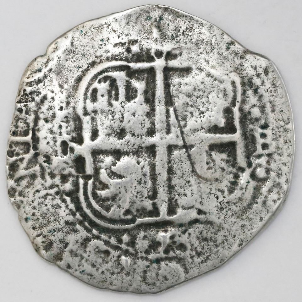 Potosi, Bolivia, cob 8 reales, 1653E, dot-PH-dot at top. S-P37a; KM-21; CT-437. 17.57 grams. Thin and smooth from corrosion but partial cross and pillars with two and a half dates visible. With certificate from the salvagers. Recovered from: Capitana, sunk in 1654 off Chanduy, Ecuador