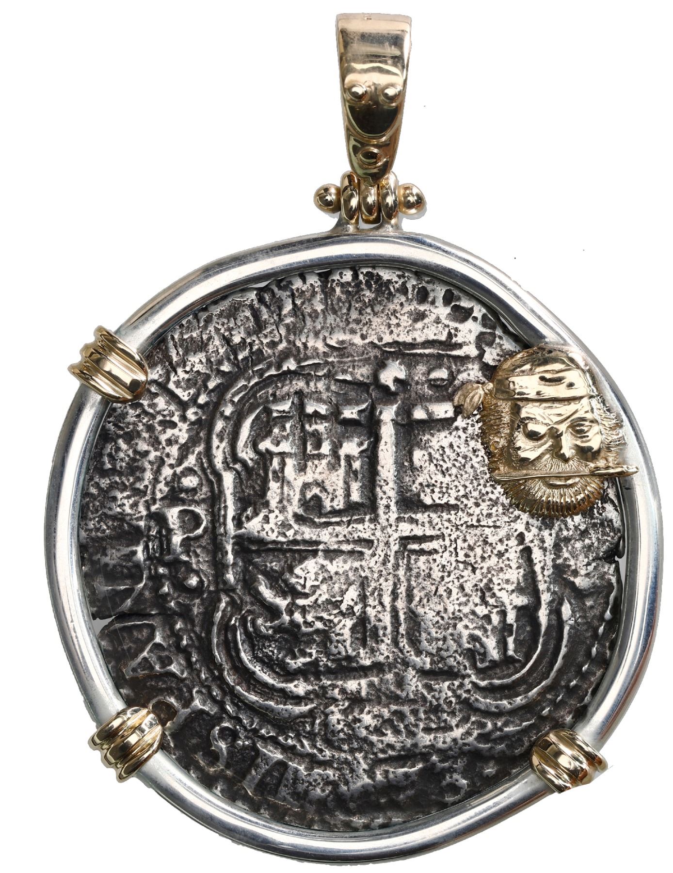 Potosi, Bolivia, cob 8 reales, 1653E, dot-PH-dot, ex-Capitana (1654), mounted cross-side out in thick silver bezel with 14K gold prongs and shackle bail and pirate-face embellishment. 31.46 grams total. Lightly corroded surfaces but still-solid coin with most of cross and pillars visible, two bold assayers and mintmarks, toned in crevices. From the Capitana (1654).