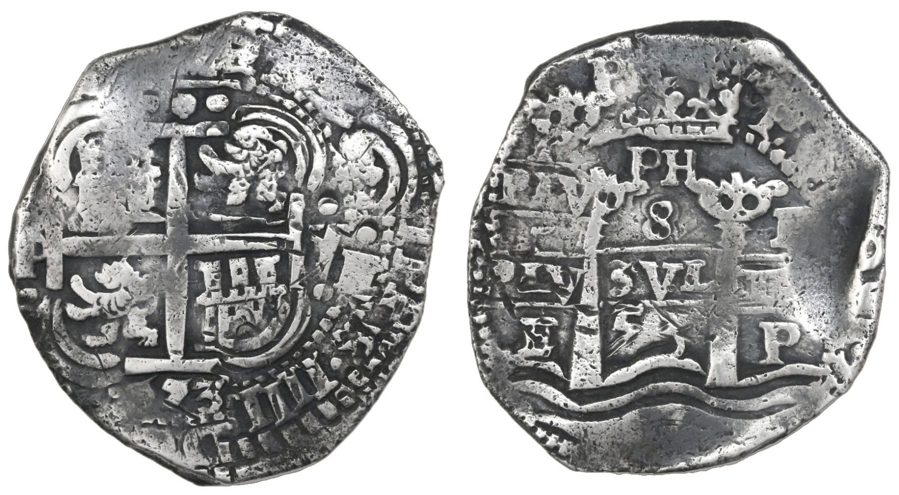 Potosi, Bolivia, cob 8 reales, 1653E, with PH at top. S-P37a; KM-21; CT-437. 26.56 grams. Smooth surfaces (toned) as corrosion-free, with full PH and pillars-and-waves, full (off-center) cross with king's ordinal IIII, trivial doubling, two dates. Pedigreed to the Rob McClung collection. Recovered from: Capitana, sunk in 1654 off Chanduy, Ecuador