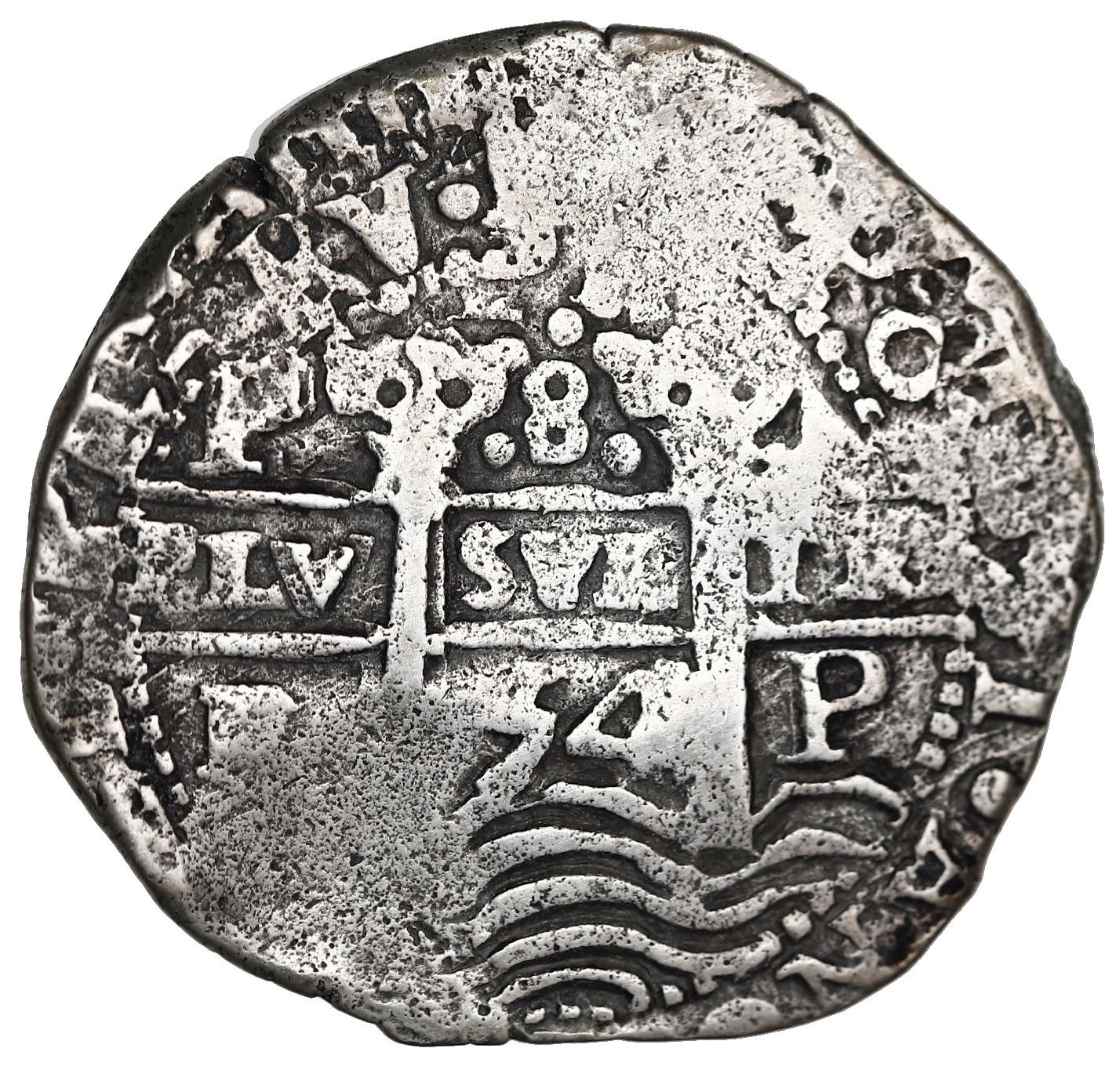 Potosi, Bolivia, cob 8 reales, 1654 E, PH at top, pomegranate above cross. S-P37a; KM-21; Cal-1506. 26.28 grams. Full pillars-and-waves with clear date and two bold mintmarks, also full (but cruder) cross with second date below, minimal surface corrosion, nice toning, smallish flan. With generic certificate from the salvors. Recovered from: Capitana, sunk in 1654 off Chanduy, Ecuador