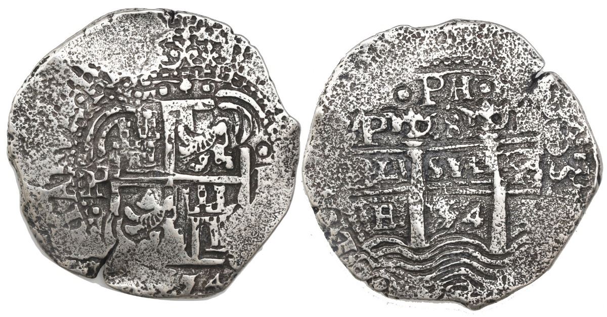 Potosi, Bolivia, cob 8 reales, 1654E, •PH• at top. S-P37a; KM-21; CT-438. 23.07 grams. Bold full pillars-and-waves with prominent •PH•, full but doubled cross, light surface corrosion, toned. Note: This lot is actually from the Capitana (1654), not the Maravillas (1656). Recovered from: Maravillas, sunk in 1656 off Grand Bahama Island