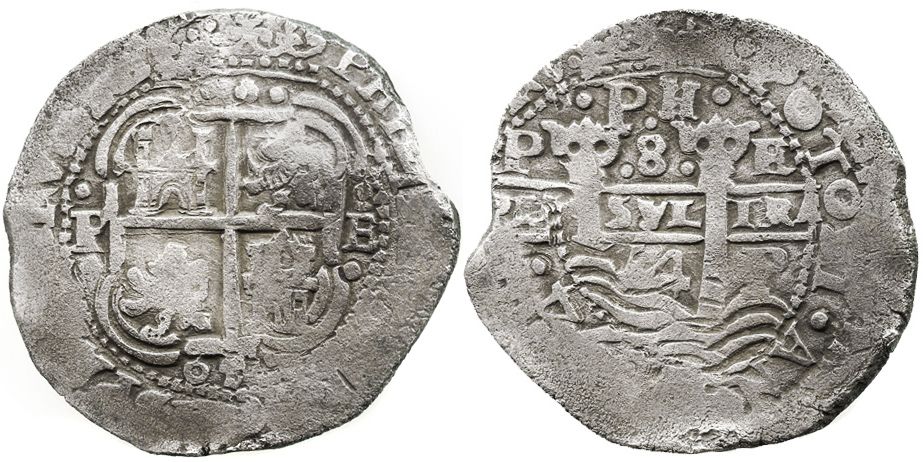 Potosi, Bolivia, cob 8 reales, 1654E, dot-PH-dot at top. S-P37a; KM-21; CT-438. 25.4 grams. Bold full cross and pillars (the latter slightly doubled), 3 dates and mintmarks, 2 bold assayers, bold .PH., full POTOSI, lightly toned and nearly corrosion-free. With Marex (Humphreys) certificate #91-8R-0705. Recovered from: Maravillas, sunk in 1656 off Grand Bahama Island
