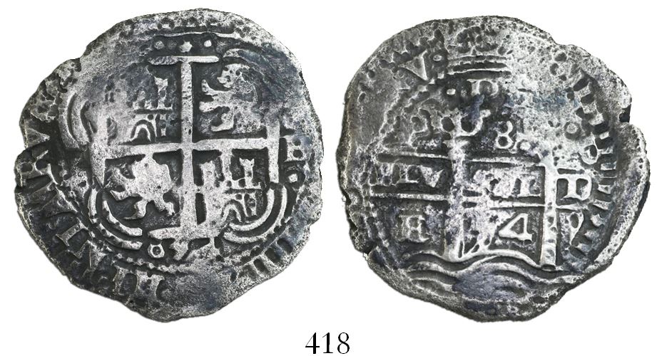 Potosi, Bolivia, cob 8 reales, 1654E, dot-PH-dot at top. S-P37a; KM-21; CT-438. 20.72 grams. Good full cross and pillars despite thinning due to corrosion, two dates, uneven toning. Pedigreed to the Rob McClung collection. Recovered from: Capitana, sunk in 1654 off Chanduy, Ecuador