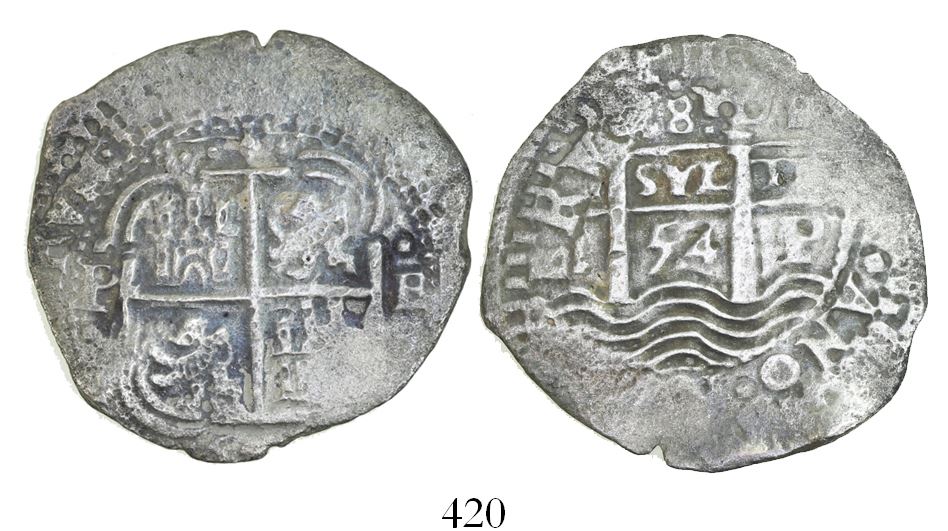 Potosi, Bolivia, cob 8 reales, 1654E, dot-PH-dot at top. S-P37a; KM-21; CT-438. 19.43 grams. Bold full pillars with choice full waves, good full cross (off-center), thin from corrosion but with contrasting tan and green sediment around details. Recovered from: Capitana, sunk in 1654 off Chanduy, Ecuador