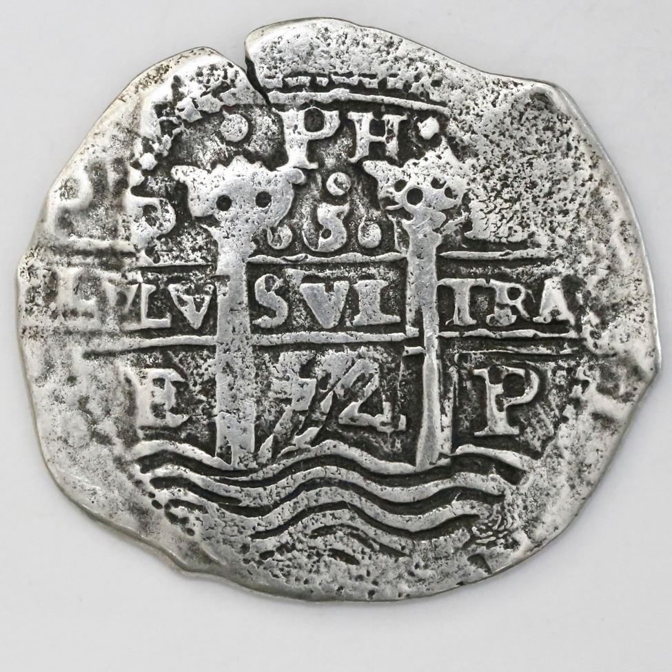 Potosi, Bolivia, cob 8 reales, 1654E, dot-PH-dot at top. S-P37a; KM-21; CT-438. 18.06 grams. Smooth cross side from corrosion but choice pillars preserved by resting on another coin (hence circular uncorroded area), some doubling but clear date, mintmark, and assayer. With certificate from the salvagers. Recovered from: Capitana, sunk in 1654 off Chanduy, Ecuador