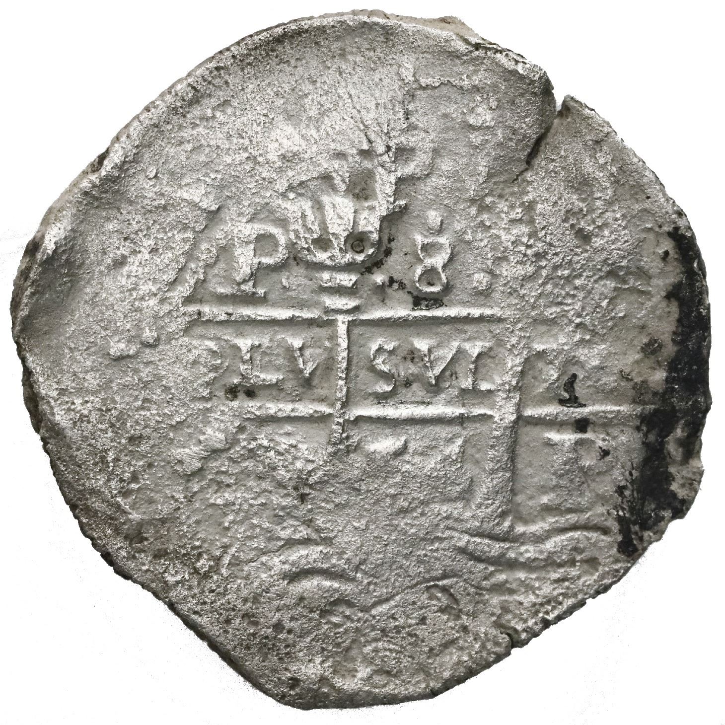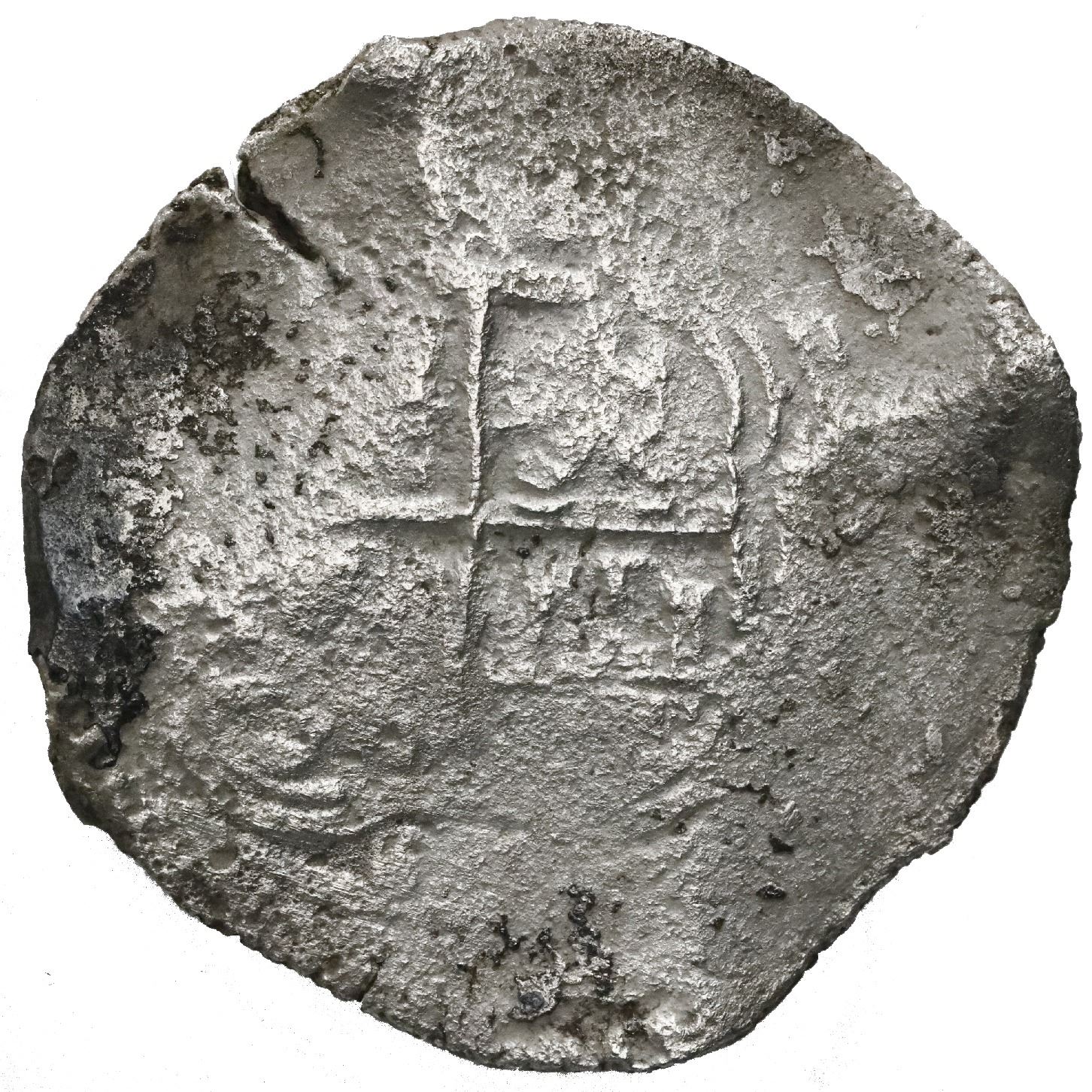 Potosi, Bolivia, cob 8 reales, 1654E, dot-PH-dot at top. S-P37a; KM-21. 24.33 grams. Large circular flan with surface corrosion, weak cross side but pillars show a fair amount of detail, spot of dark horn silver along the edge, desirable provenance and certification. With original State of Florida Division of Historical Resources plastic tag #17,581 and Sedwick certificate from 1997. From: "Jupiter Wreck" (San Miguel el Arcangel), sunk in 1659 off the east coast of Florida
