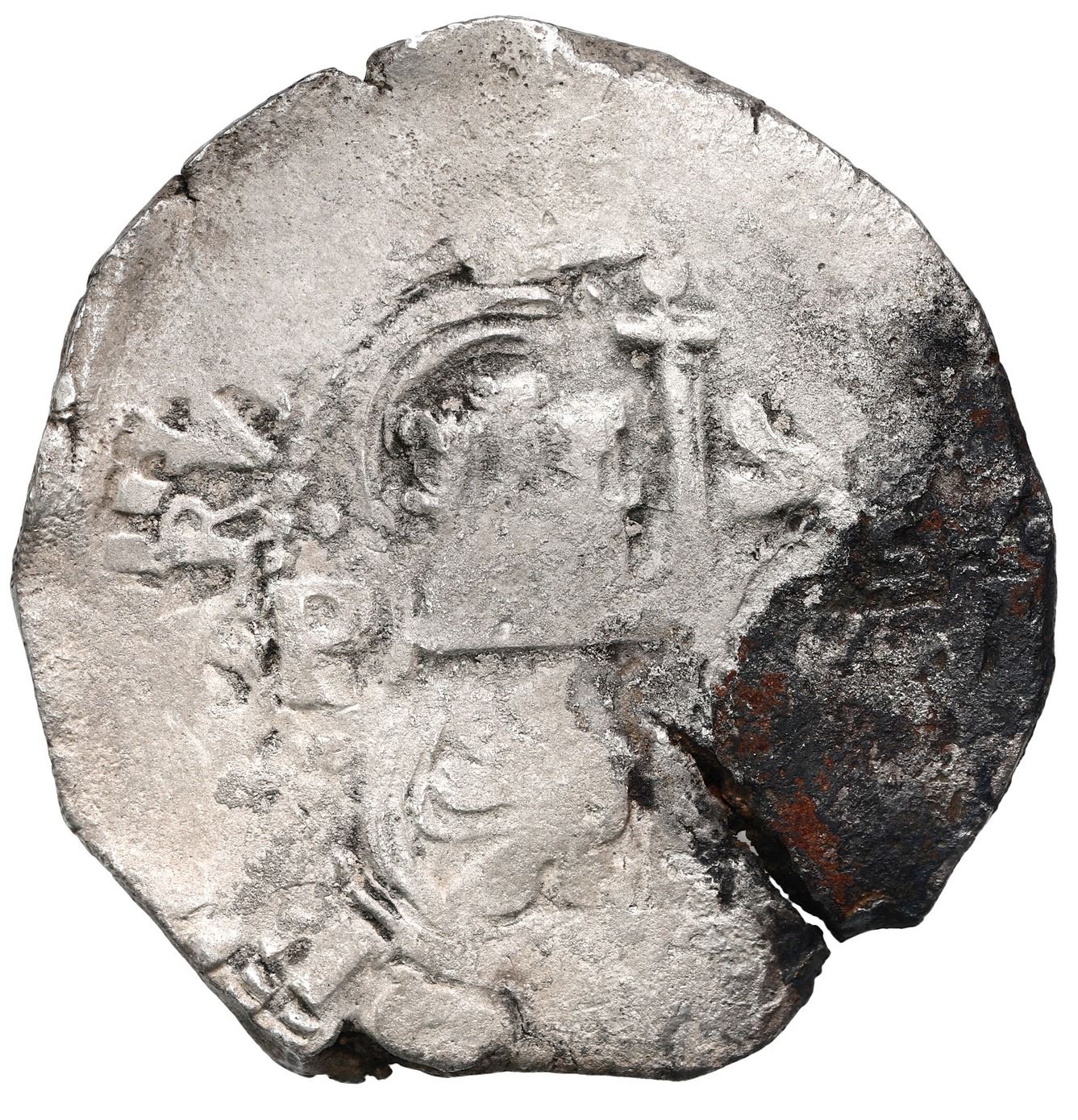 Potosi, Bolivia, cob 8 reales, 1655 E, pomegranate above cross. S-P37a; KM-21; Cal-1509. 25.08 grams. Weakly struck with somewhat dusty surfaces but not much corrosion, bold waves, most of pillars and cross, edge-split next to dark area. With photo-certificate. From: "Jupiter Wreck" (San Miguel Arcangel), sunk in 1659 off the east coast of Florida