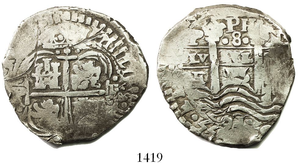 Potosi, Bolivia, cob 8 reales, 1655E, PH at top. S-P37a; KM-21 ;CT-439. 27.17 grams. Full but doubled pillars with 2 dates, full but off-center cross, About Fine with toned fields, old scratches.