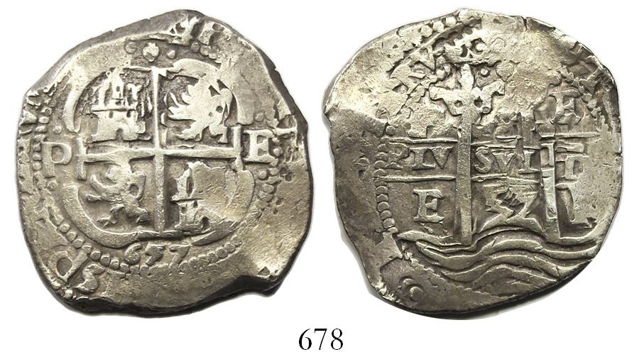 Potosi, Bolivia, cob 8 reales, 1657E, pomegranate at top on both sides. S-P37a; KM-21 ;CT-445. 27.73 grams. Nice full cross, full but slightly doubled pillars, two dates, three mintmarks and assayers, lightly toned AVF.