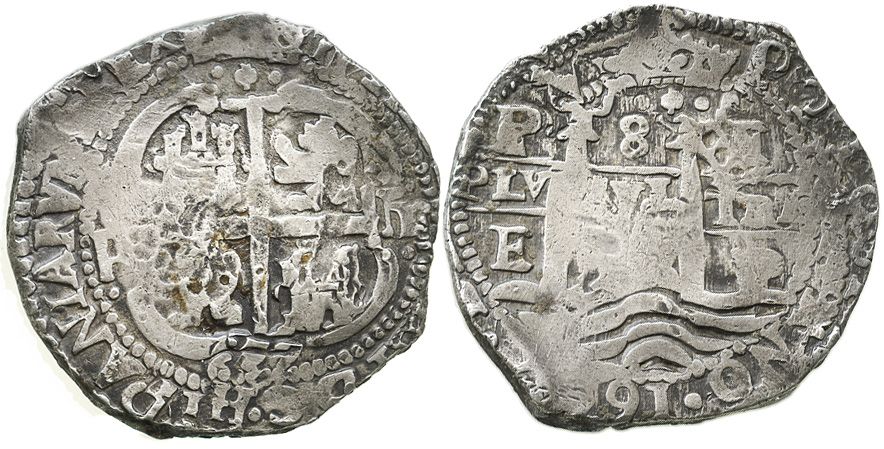 Potosi, Bolivia, cob 8 reales, 1657E, pomegranate at top. S-P37a; KM-21; CT-445. 27.3 grams. Full but doubled and partially flat pillars-and-waves, full but oddly pockmarked cross, most of 3 dates and assayers and mintmarks, richly toned Fine+ overall.
