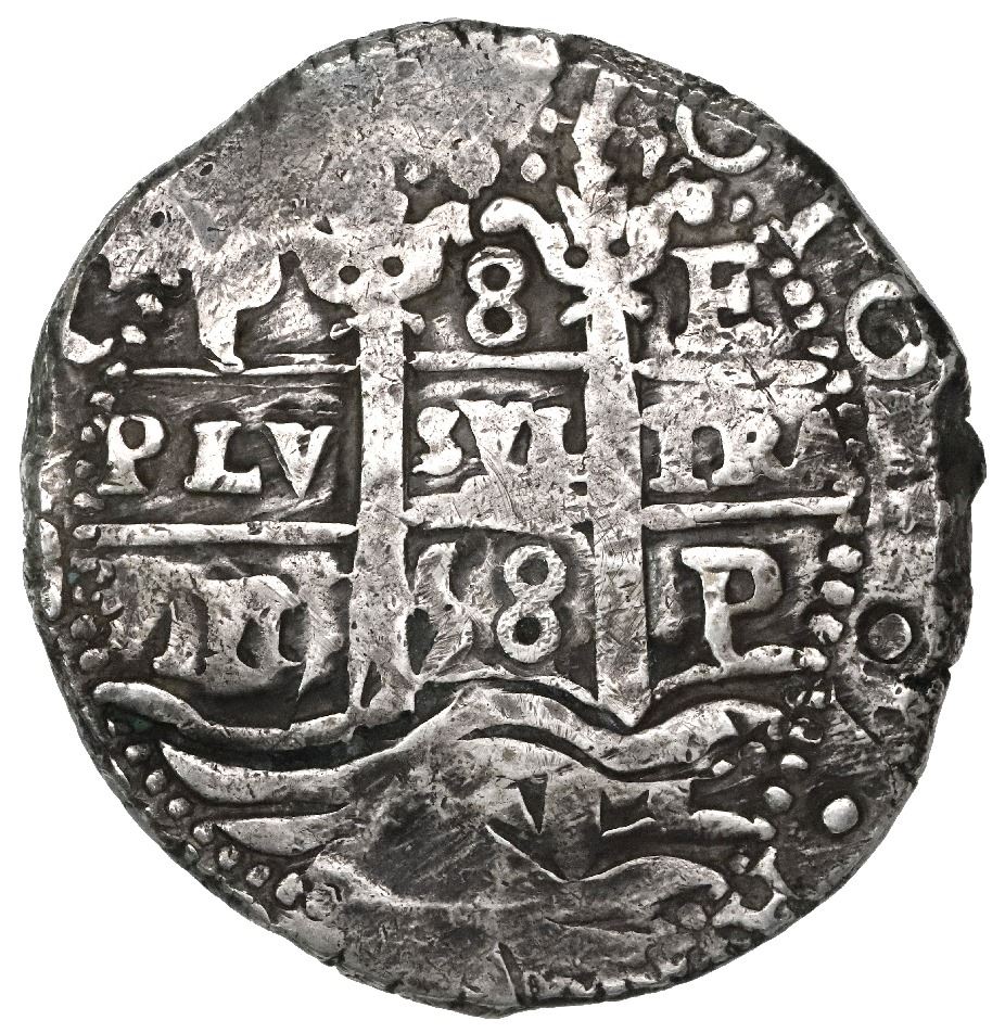 Potosi, Bolivia, cob 8 reales, 1658E, denomination 8 above cross (rare). S-P37a; KM-21; Cal-1522. 27.58 grams. Round flan with minimal legends but bold interior details including full pillars-and-waves and cross (minor weak spots), clear dot-8-dot above cross (rarer variety for this date), two dates, three mintmarks and assayers, well-centered Fine. Pedigreed to the Arturo Rosenheim collection.