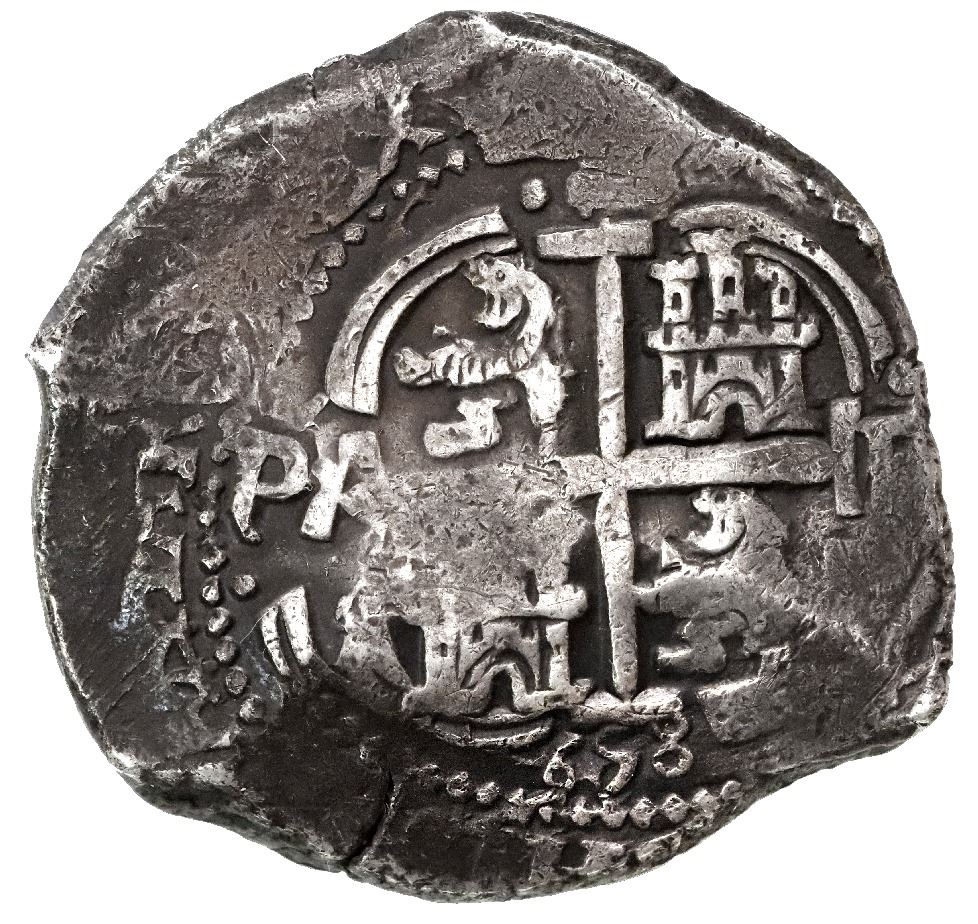 Potosi, Bolivia, cob 8 reales, 1658E, pomegranate above cross, quadrants of cross transposed (very rare). S-P37a; KM-21; Cal-1521. 27.94 grams. First example we've handled of this very rare transposition error, the cross-castles-lions and pillars-and-waves full and choice but slightly doubled, two dates, three mintmarks and assayers, deeply toned VF with hairline edge-split. Pedigreed to the Arturo Rosenheim collection.