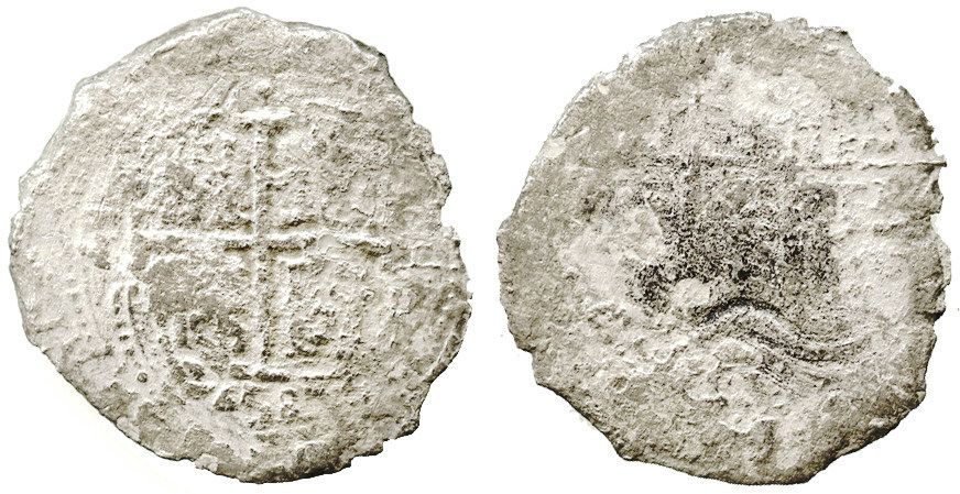 Potosi, Bolivia, cob 8 reales, 1658E. S-P37a, KM-21, CT-446. 21.2 grams. Moderately corroded all over but with clear full cross above date, full pillars-and-waves. Recovered from: "Jupiter wreck" (San Miguel el Arcangel), sunk 1659 off the east coast of Florida
