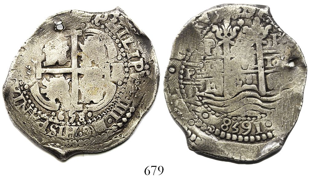 Potosi, Bolivia, cob 8 reales, 1658E. S-P37a; KM-21. 27.88 grams. Broad and slightly barrel-shaped flan (more like a Mexican cob), with full four-digit date in legend (the other two visible as well), full but somewhat flat pillars-and-waves and cross, bold king's ordinal IIII, holed at edge near top of cross, Fine+ with light toning all over.