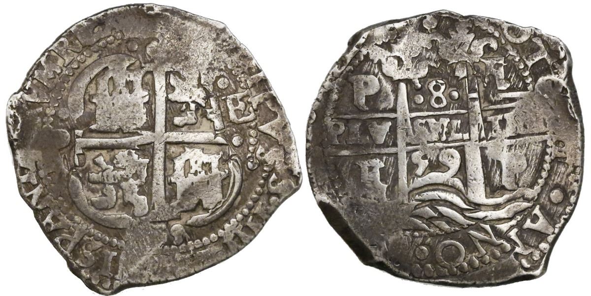 Potosi, Bolivia, cob 8 reales, 1659E. S-P37a; KM-21; CT-447. 27.95 grams. Smallish flan with full but partially weak pillars-and-waves and cross, two dates, three mintmarks and assayers, lightly toned Fine+.