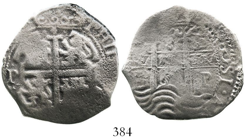 Potosi, Bolivia, cob 8 reales, 166(?)E. 18.5 grams. Good full crown and cross, full pillars above bold waves, typically thin from corrosive wear. With ROBCAR photo-certificate #M003618. From the Consolacion, sunk in 1681 off Isla de Muerto, Ecuador