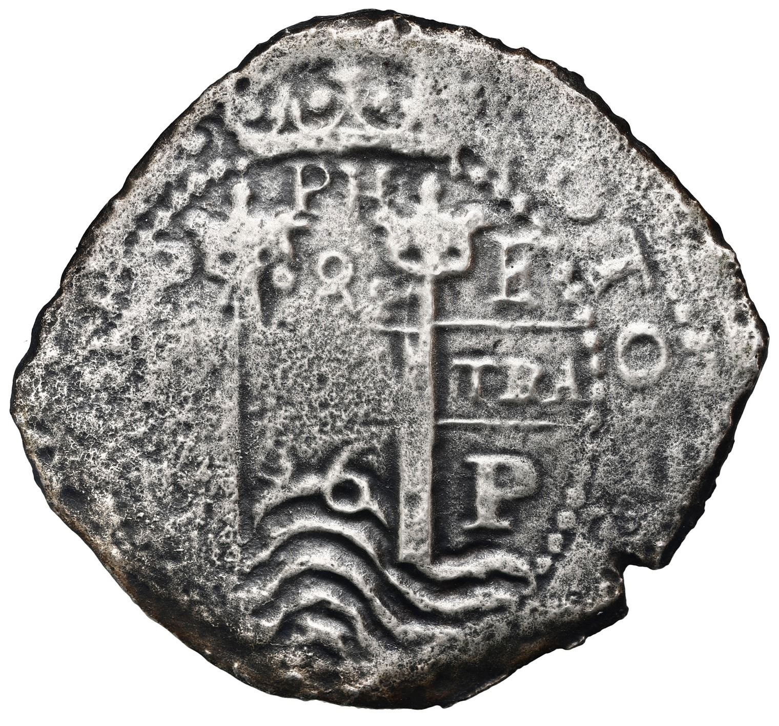 Potosi, Bolivia, cob 8 reales, 1662 E. S-P37a; KM-21; Cal-1526. 26.29 grams. Large flan, full weight despite light surface corrosion all over, no toning, full waves, parts of all three dates and assayers, edge-split. With Sedwick photo-certificate, pedigreed to Sedwick Auction 22, with original lot-tag 371. From: Consolacion, sunk in 1681 off Santa Clara Island, Ecuador