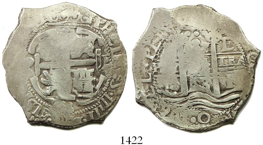 Potosi, Bolivia, cob 8 reales, 1663E. S-P37a; KM-21 ;CT-452. 26.96 grams. Silvery Fine with flat spots, much legend including full EL PERV and king's ordinal IIII, lightly toned fields.