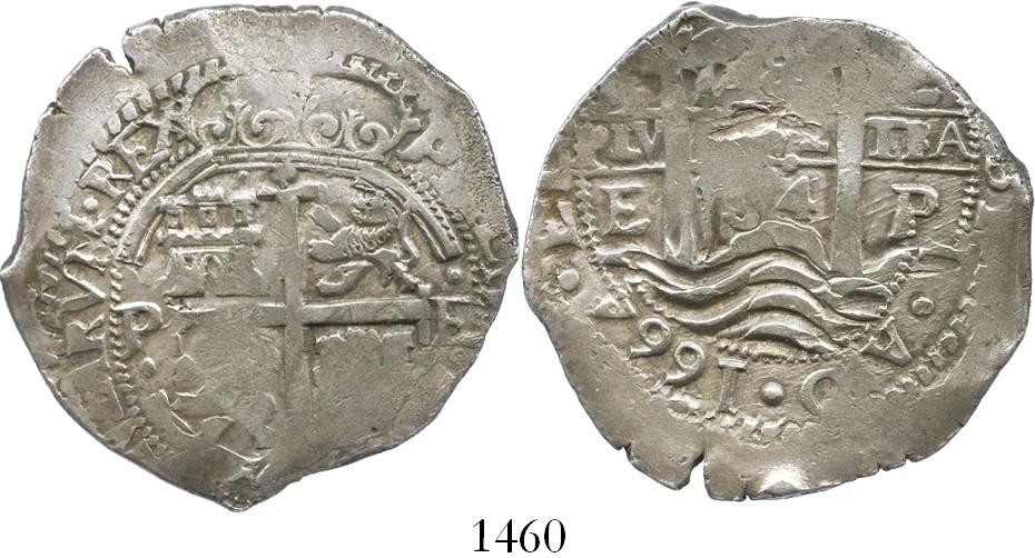 Potosi, Bolivia, cob 8 reales, 1664E. S-P37a; KM-21; CT-453. 26.0 grams. Very bold 4-digit date in legend, bold waves, choice full crown above off-center cross, lightly toned VF+.