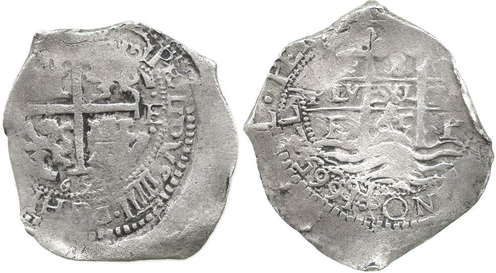 Potosi, Bolivia, cob 8 reales, 1665E, 3 full dates (rare thus). S-P37a; KM-21; CT-454. 24.0 grams. Off-center strike on a broad, thin flan, with a full 4-digit date in the legend as a result, also full king's name and ordinal, part of edge upturned, toned around details, minimal corrosion. Recovered from: Unidentified ca.-1671 wreck in Seville harbor