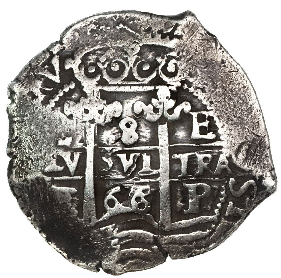 Potosi, Bolivia, cob 8 reales, 1666E, date as 66 between pillars and 666 below cross.