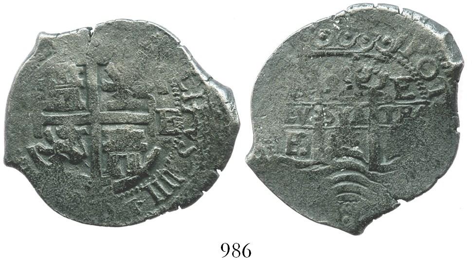 Potosi, Bolivia, cob 8 reales, 1666E. S-P37a; KM-21. 25.6 grams. Broad flan, somewhat urn-shaped, with good full cross, full crown above full but somewhat flat pillars, light wear but not corroded, darkly toned all over (no contrast), bold king's ordinal IIII in legend. With Sedwick certificate from 2004. From: Piedmont ("Lyme Bay wreck"), sunk in 1795 off Cornwall, England